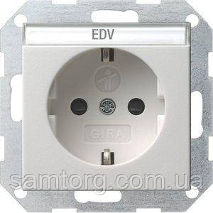 Технічні характеристики і опис Розетка Gira System 55 2К+З, шторки, поле для напису, білий